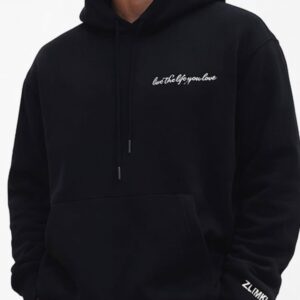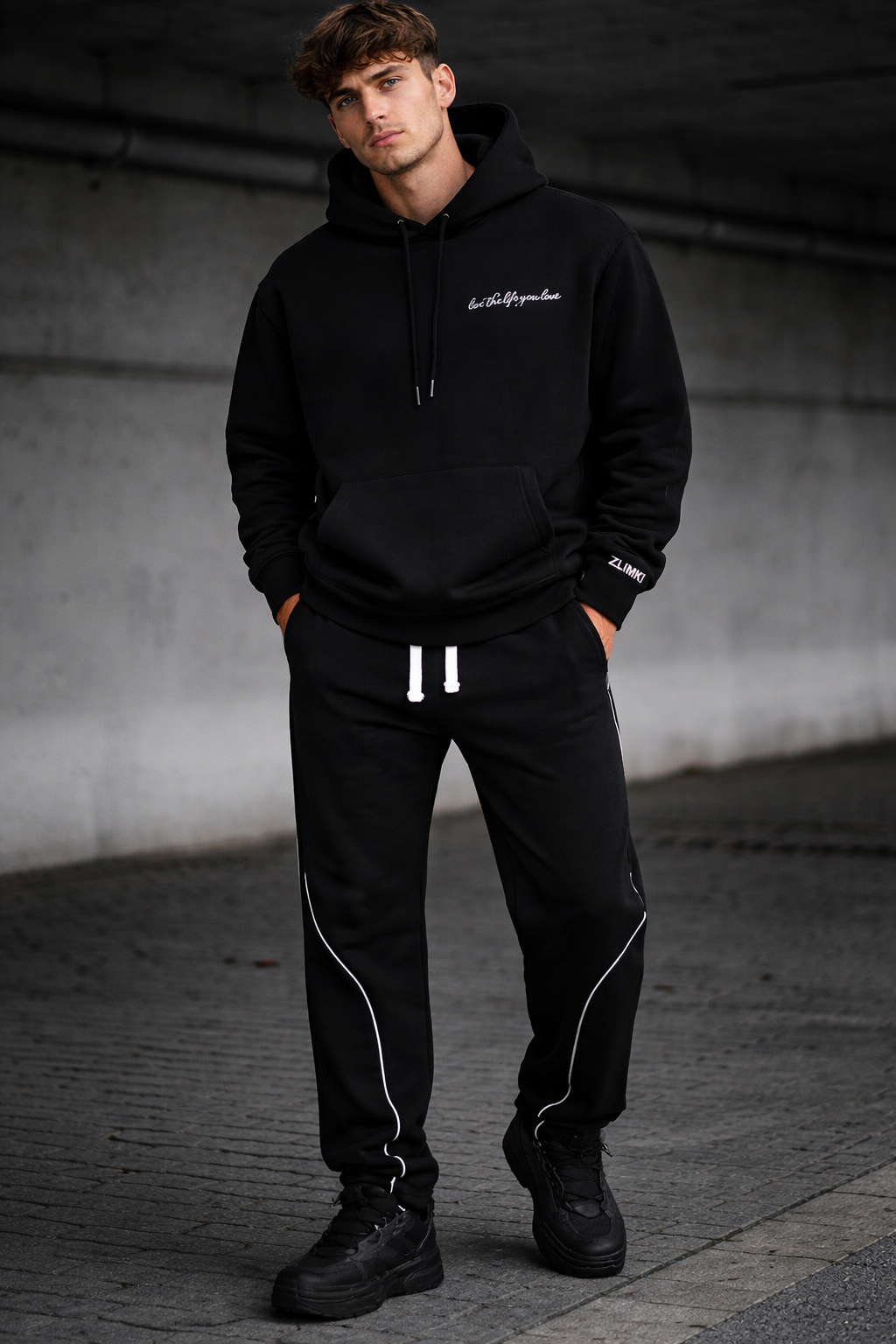 Ensemble hoodie + pantalon noir conçu pour une vibe streetwear totale. Le hoodie affiche un message double face puissant (“Live the life you love“ à l’avant, “Love the life you live“ au dos), combiné à un pantalon au fit moderne et minimaliste. Un set complet pour un style clean, affirmé et sans compromis.